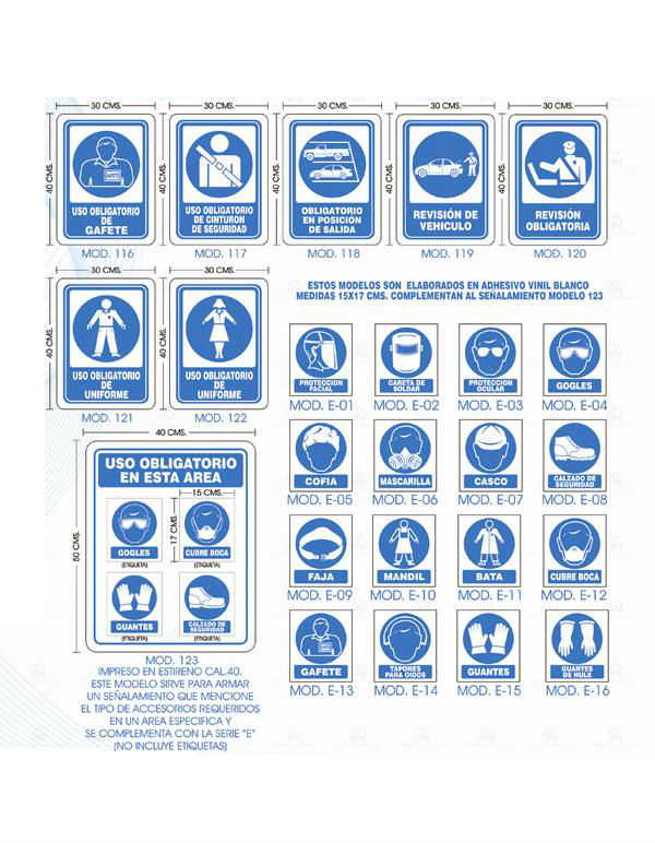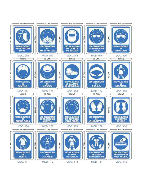 Estas señales son comunes en entornos laborales, industriales, de construcción y espacios públicos. Algunos ejemplos incluyen: “Uso obligatorio de casco”, “Usar guantes”, “Protección ocular obligatoria” o “Lavarse las manos”.
