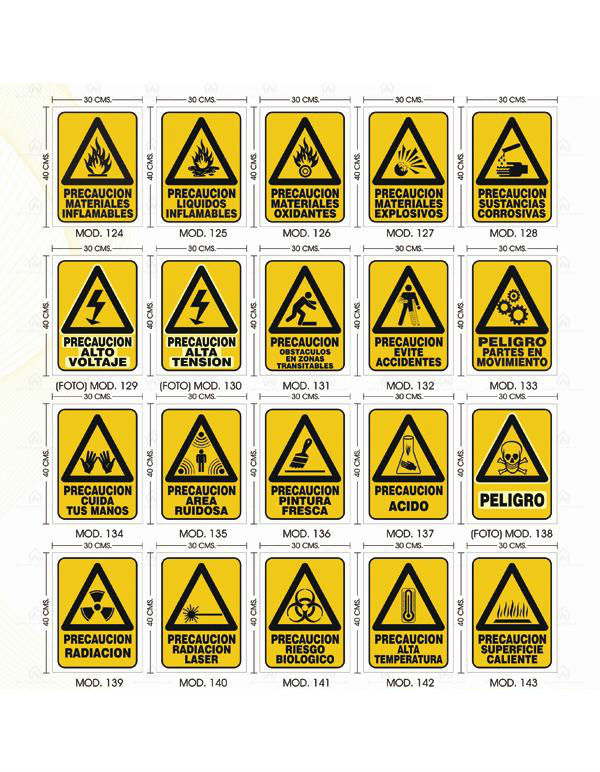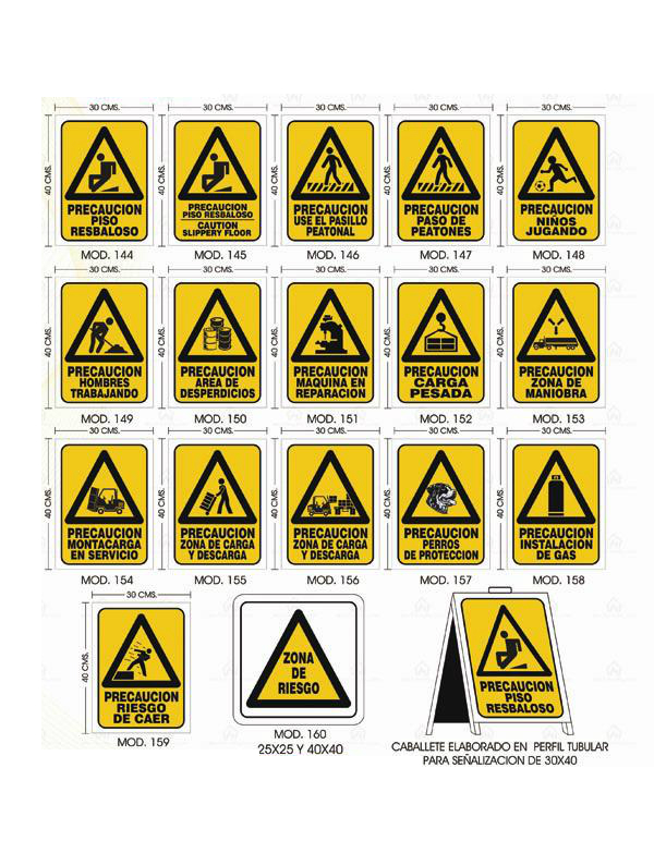 Se utilizan comúnmente para indicar situaciones como: “Piso resbaloso”, “Riesgo eléctrico”, “Material inflamable” o “Zona de maquinaria en movimiento”.